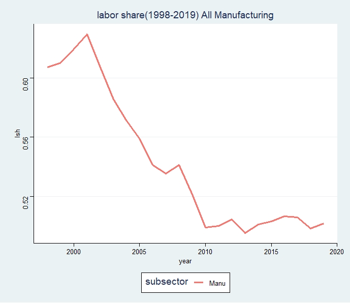 The US manufacturing sector added about 2370.9 bn USD in the year 2019 to the US economy and employed close to 12.5 million laborers. The average annual growth rate of value-added from 1997-2019 was 2.44 and the growth rate of the nominal wage bill was 1.52, which implies that the share of labor in value added declined. Despite the treatment of “Manufacturing” as a sector with similar production technologies or comparable production processes, within manufacturing, there are observable differences within subsectors. For example, certain subsectors claim the largest value-added share and the largest employment share consistently. Figure below shows the decline in labor share in manufacturing.