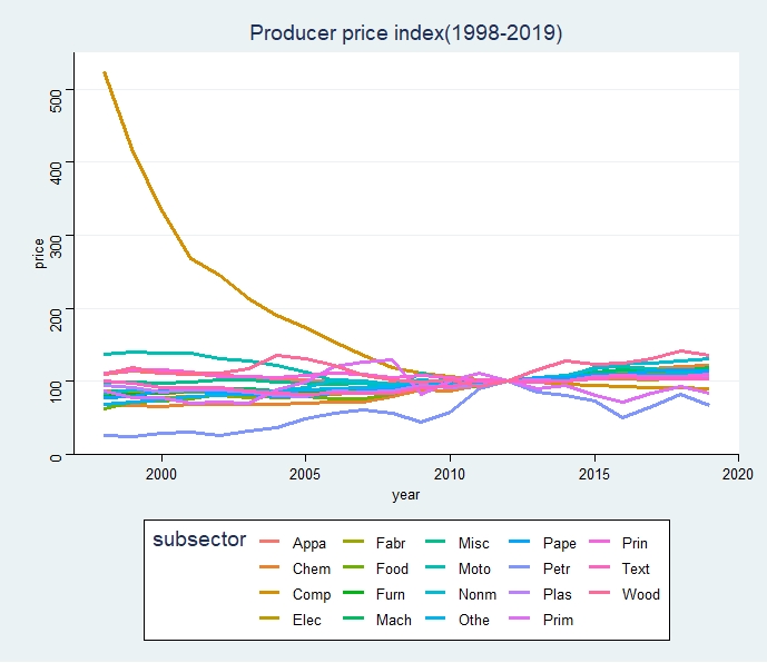 Computer and electronic products have seen the largest decline in prices which is starkly different from other subsectors. Controlling for quality of products, the price decline in this subsector have been very rapid. Later in the document, I discuss why Computer and Electronic products are clear outliers in the manufacturing sector. This sector has also largely been “servicified” with increasing production offshored to other countries.
