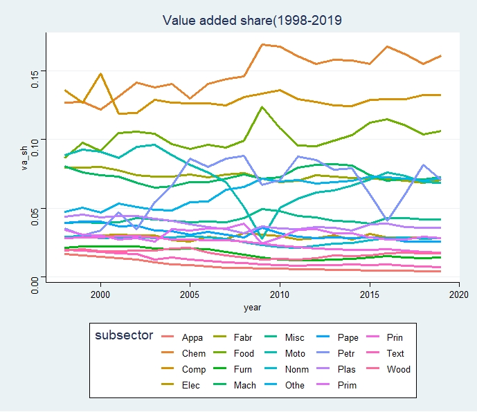 Figures below show the average employment and value-added shares for different subsectors for the year 2019 and 1997 respectively. From both these figures it is clear that there are some leading subsectors which have higher than average shares. For eg: in 1998 Chemical products(16 %) Computer and Electronic products (13%), Food and tobacco products (10 %) contributed to 33% of manufacturing value added. These sectors combined, employed about 30 % of the total labor(Figure 2.2, the top three employment share curves).